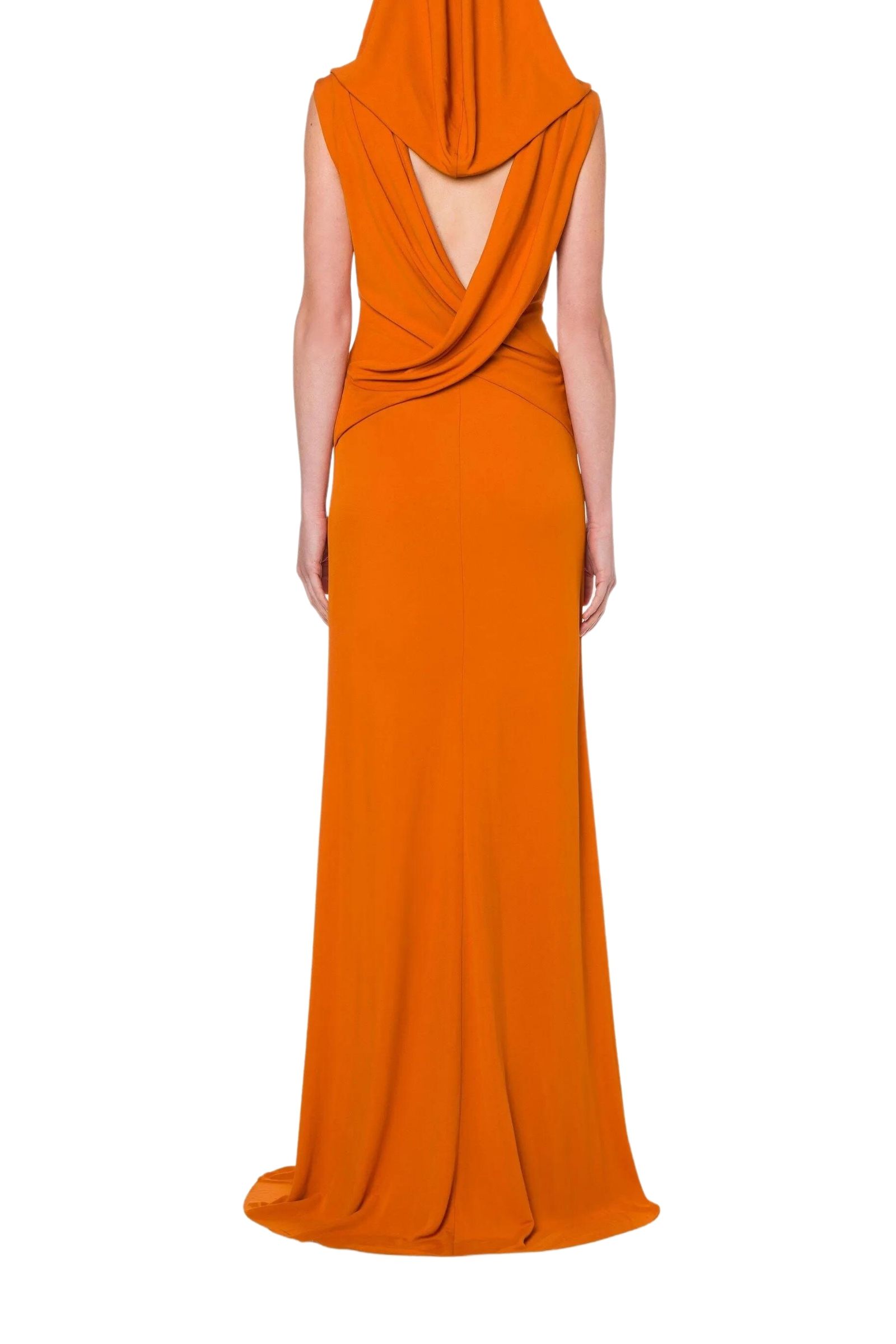 Abito lungo in organzino organico, tessuto che dona un'estrema fluidità al modello. Il design è innovativo, con morbido cappuccio che può essere portato alto, a coprire il capo, o sceso sul dietro. Morbidi drappeggi si intrecciano definendo una silhouette molto femminile, che si completa con un lungo spacco sulla gonna.