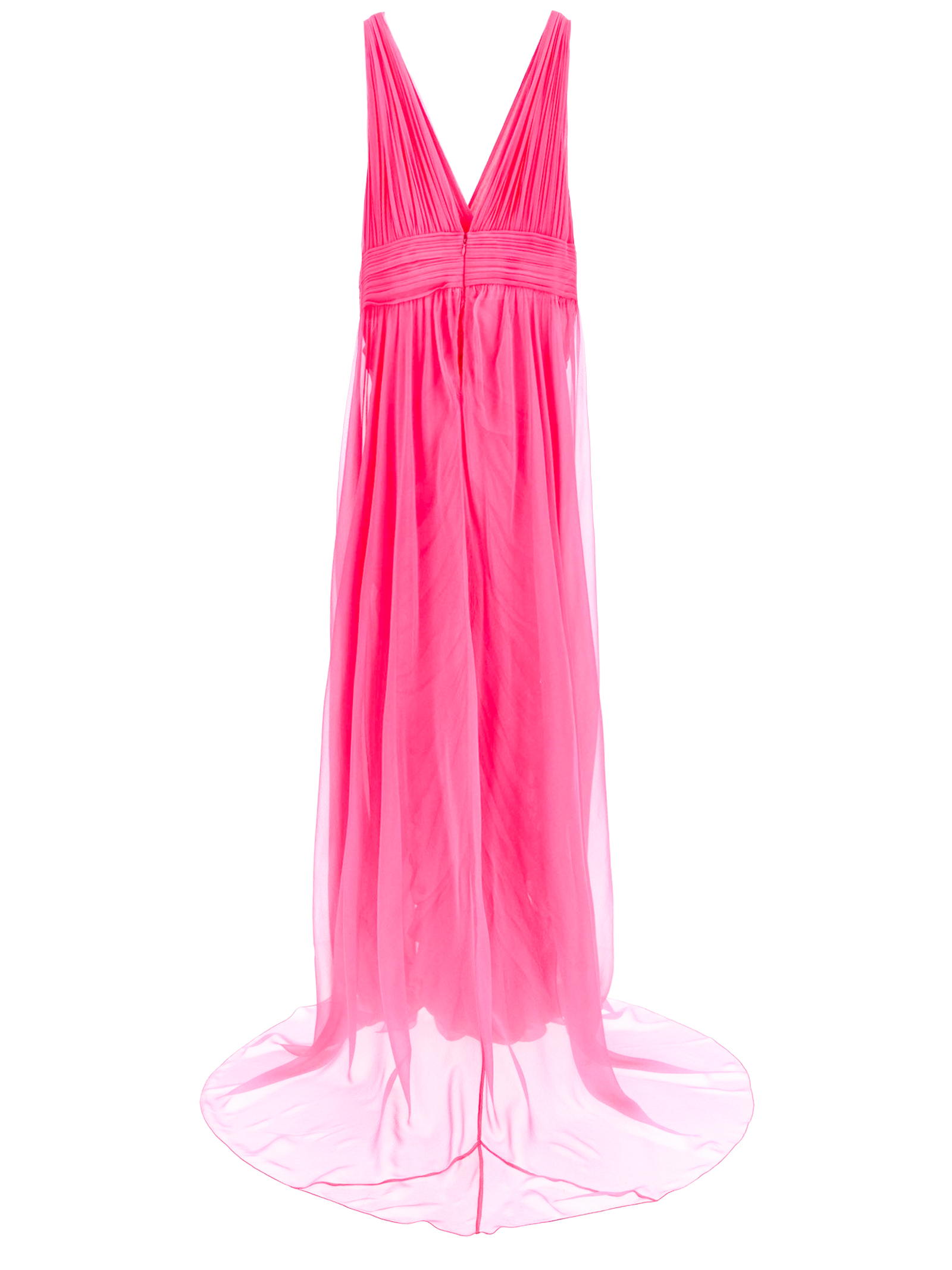 Questo abito lungo firmato Alberta Ferretti dal desin drappeggiato è caratterizzato da scollo profondo a V, scollo a V sulla schiena. Senza maniche, taglio svasato, chiusura posteriore con zip nascosta e strascico.