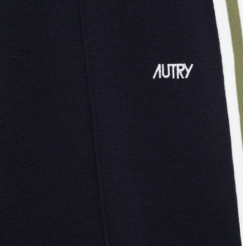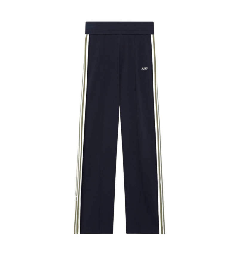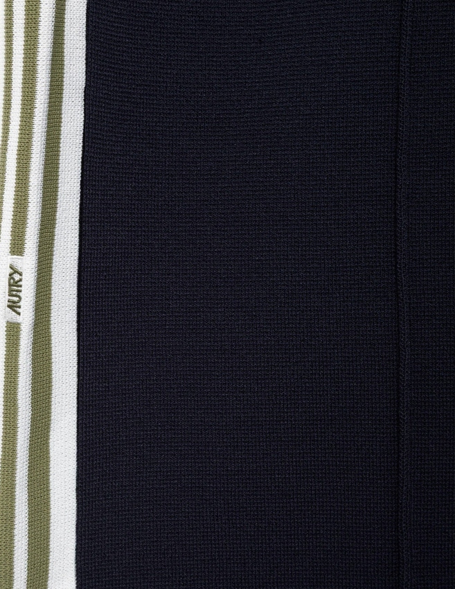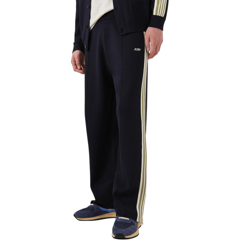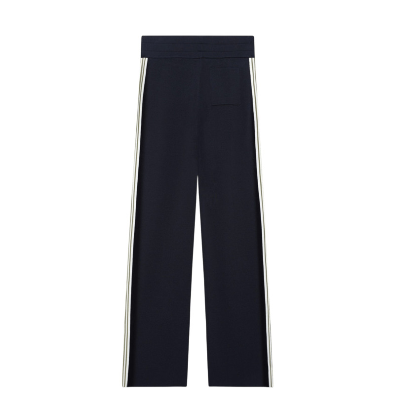Pantalone jogger in maglia di misto viscosa con vita elasticata, gamba dritta con spacco sul fondo e bande laterali a righe a contrasto.