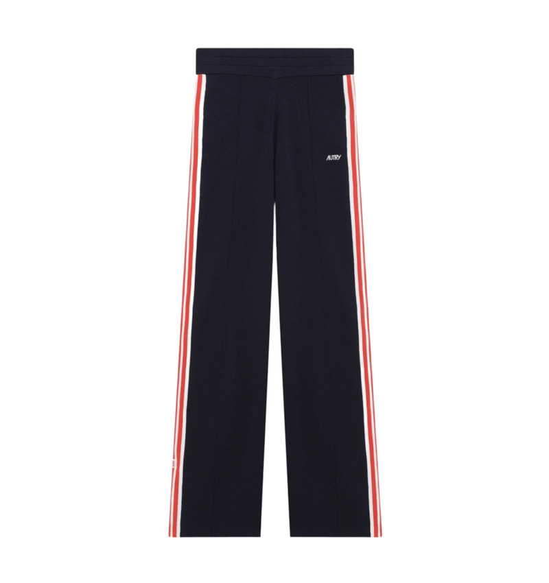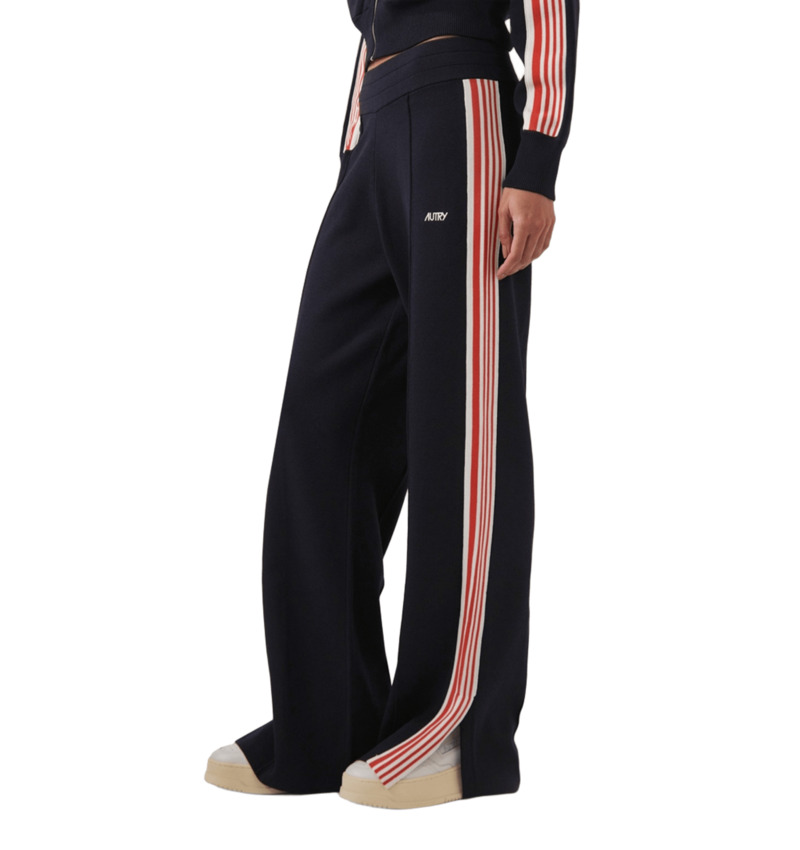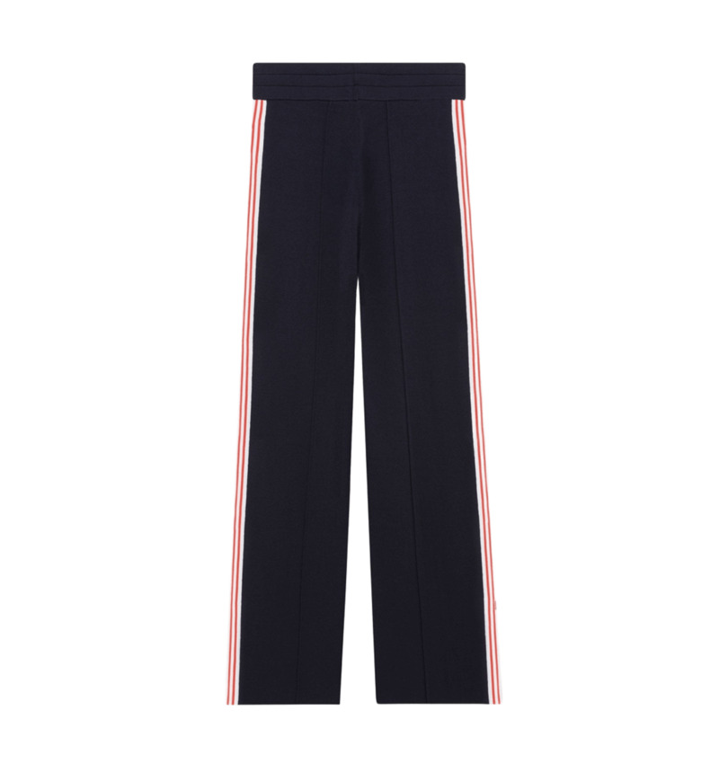 Pantalone jogger in maglia di misto viscosa con vita elasticata, gamba dritta con spacco sul fondo e bande laterali a righe a contrasto.