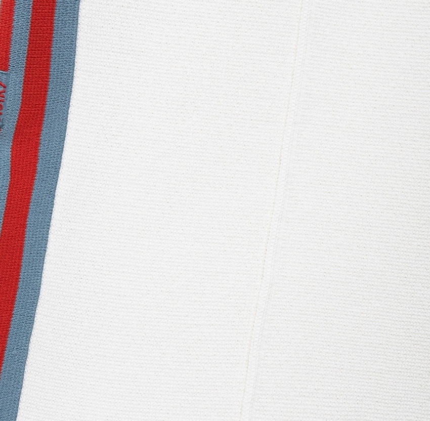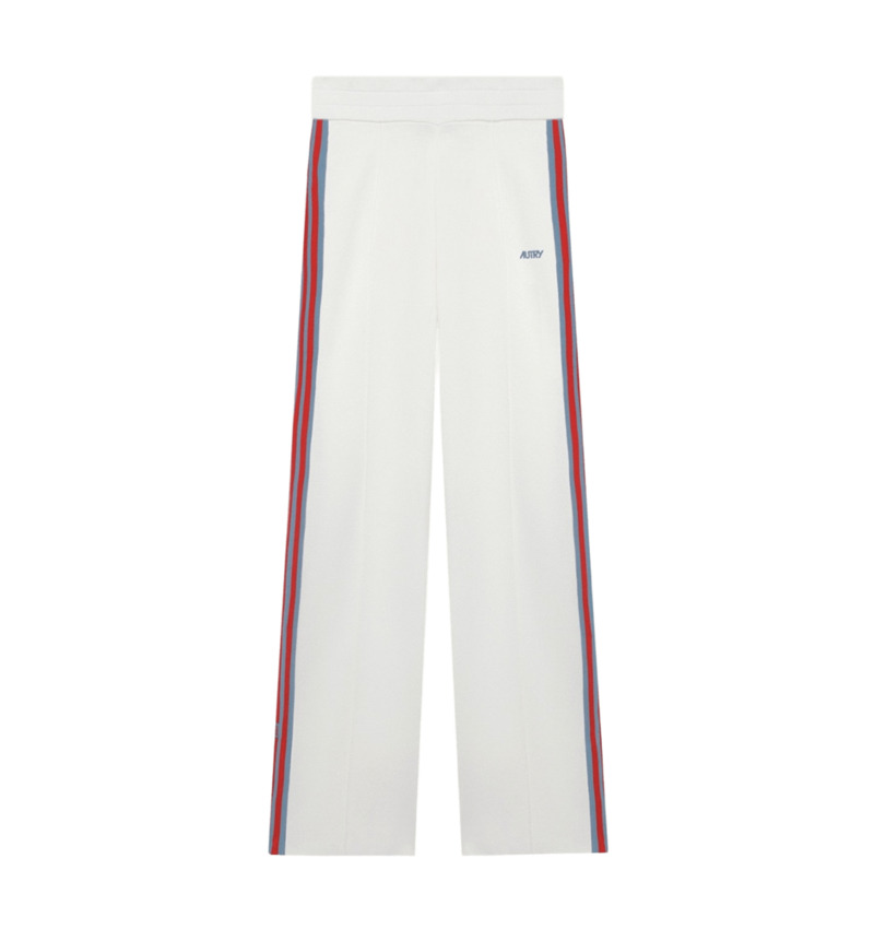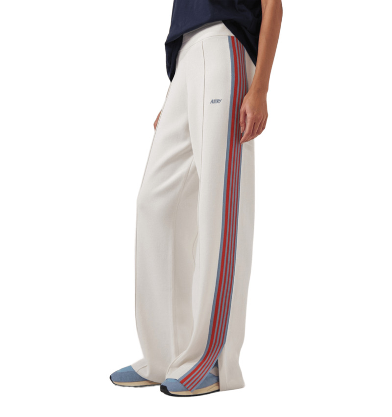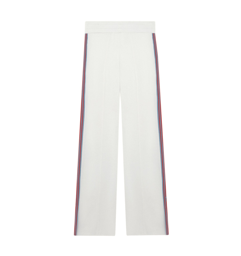 Pantalone jogger in maglia di misto viscosa con vita elasticata, gamba dritta con spacco sul fondo e bande laterali a righe a contrasto.
