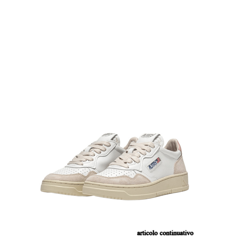 Questa scarpa da ginnastica da donna è realizzata in morbida pelle bianca dall'aspetto autentico ed è rifinita con rinforzi in suede beige per un mix tattile e grafico deciso. Il dettaglio in pelle rosa che decora il tallone è personalizzato con il logo Autry.