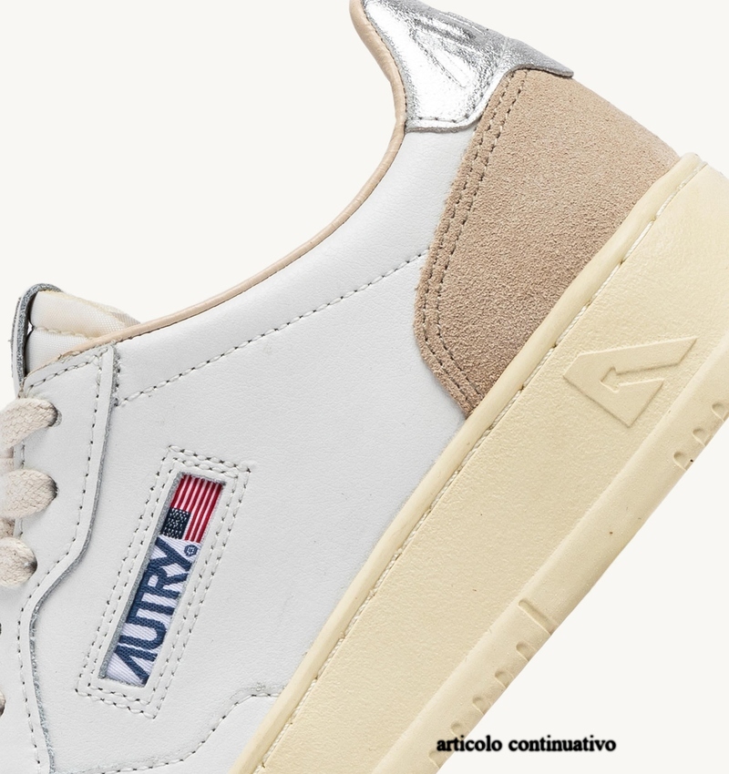 Questa scarpa da ginnastica da donna è realizzata in morbida pelle bianca dall'aspetto autentico ed è rifinita con rinforzi in suede beige per un mix tattile e grafico deciso. Il talloncino posteriore ha un finish metallizzato color argento.
