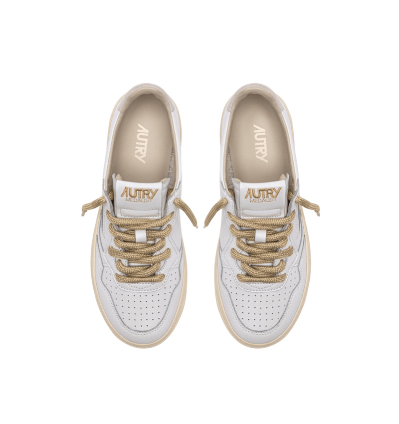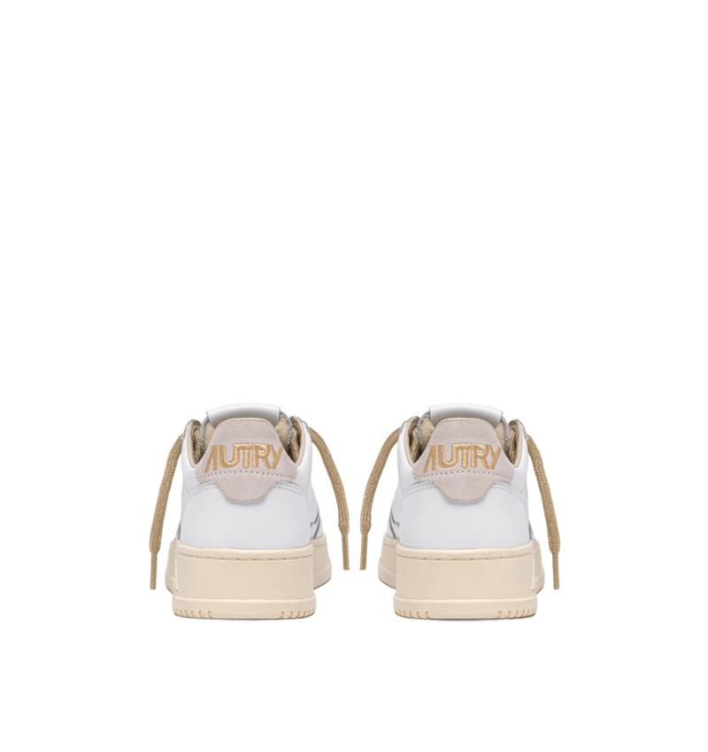 Questa scarpa da ginnastica da donna è realizzata in morbida pelle bianca dall'aspetto autentico ed è rifinita con originali dettagli come i lacci e il logo laterale con effetto lurex dalla raffinata nuance oro. Il dettaglio in suede beige che decora il tallone è personalizzato con il logo Autry ricamato in tono.