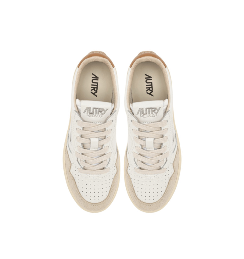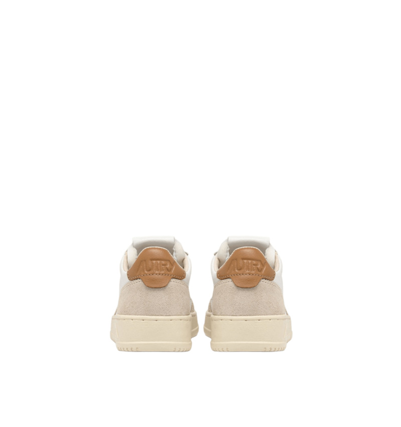Questa scarpa da ginnastica da uomo è realizzata in morbida pelle bianca dall'aspetto autentico ed è rifinita con rinforzi in suede beige per un mix tattile e grafico deciso. Il dettaglio in pelle marrone chiaro che decora il tallone è personalizzato con il logo Autry.