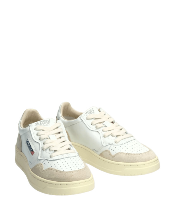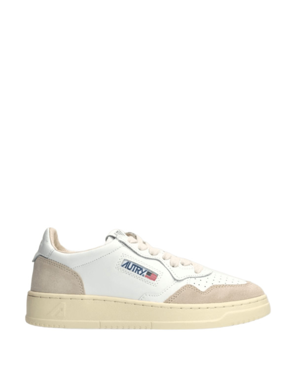 Questa scarpa da ginnastica da donna è realizzata in morbida pelle bianca dall'aspetto autentico ed è rifinita con rinforzi in suede beige per un mix tattile e grafico deciso. Il dettaglio in pelle bianca che decora il tallone è personalizzato con il logo Autry.