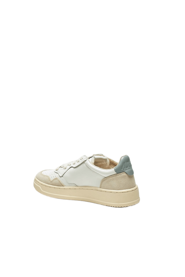 Questa scarpa da ginnastica da donna è realizzata in morbida pelle bianca dall'aspetto autentico ed è rifinita con rinforzi in suede beige per un mix tattile e grafico deciso. Il dettaglio in pelle celeste che decora il tallone è personalizzato con il logo Autry.