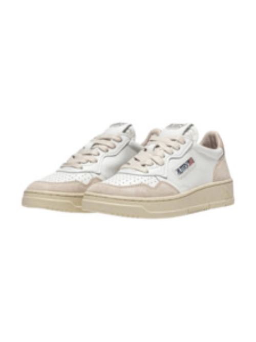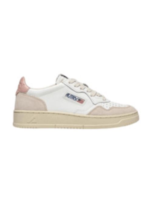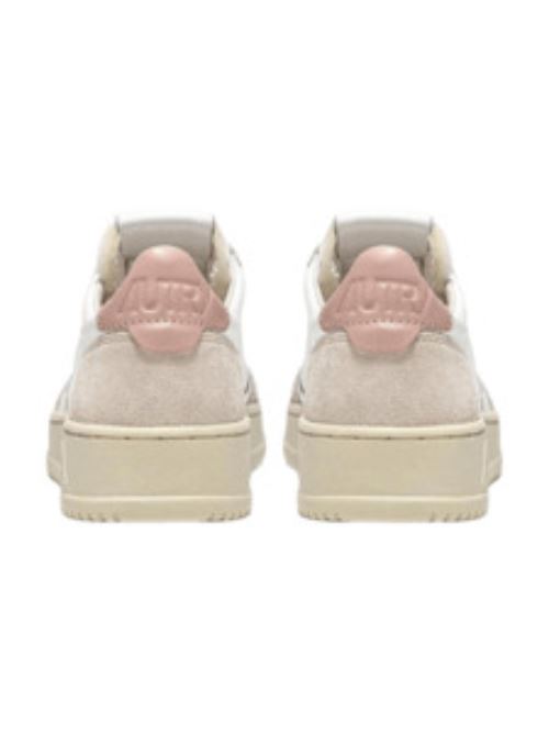 Questa scarpa da ginnastica da donna è realizzata in morbida pelle bianca dall'aspetto autentico ed è rifinita con rinforzi in suede beige per un mix tattile e grafico deciso. Il dettaglio in pelle rosa che decora il tallone è personalizzato con il logo Autry.
