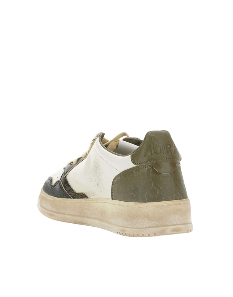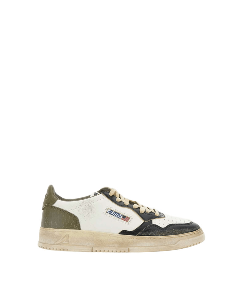 Questa scarpa da ginnastica da uomo è realizzata in pelle morbida dal look vissuto che combina le tonalità del bianco, nero e verde. L'inserto laterale cattura l'attenzione sul caratteristico logo Autry. Il trattamento esclusivo utilizzato per creare l'aspetto vintage è interamente.