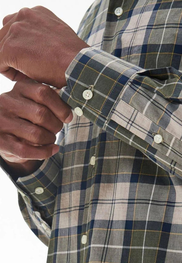 Queta camicia barbour presenta stampa tartan su tutta la superficie, colletto button-down per un look raffinato, chiusura frontale con bottoni per praticità d'uso, taschino al petto con logo Barbourmm realizzata con un mix di 95% cotone e 5% cashmere per un tocco morbido e lussuoso. Ideale per occasioni sia formali che informali