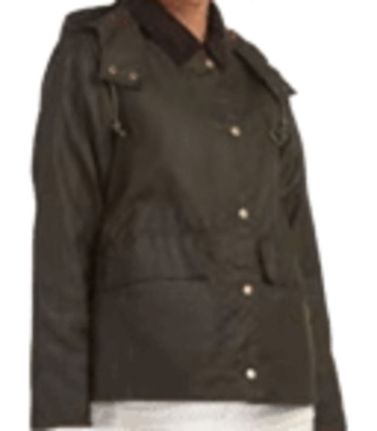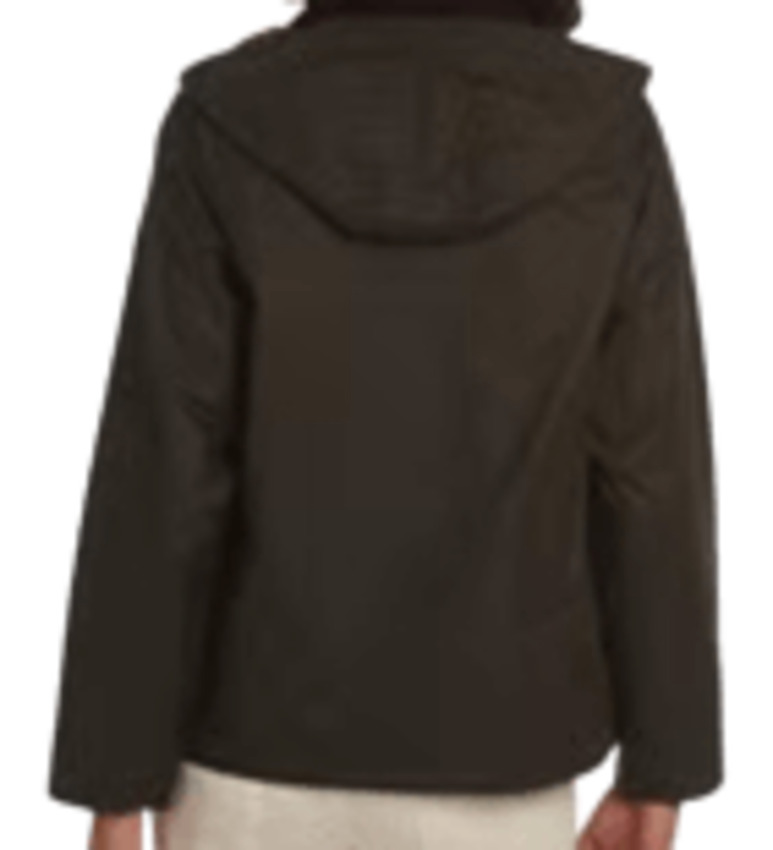 Giacca da donna con cappuccio staccabile e colletto in velluto in cotone cerato color verde oliva