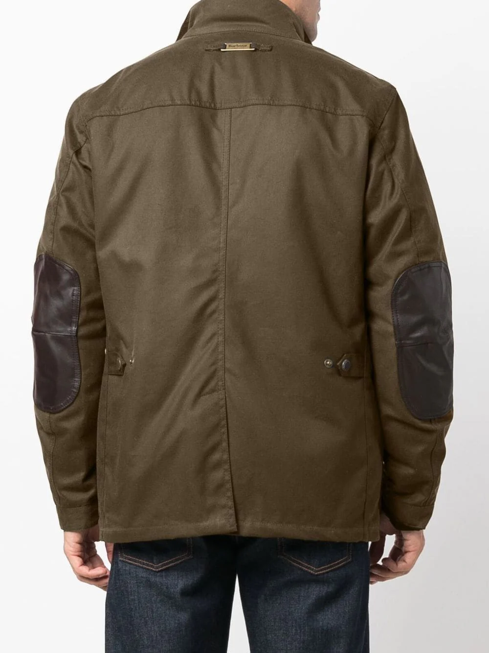 Giacca in cotone cerato, con toppe sui gomiti presenta chiusura frontale con bottoni automatici logati e patta frangivento. Patta antivento interna, fissa, chiusa con cerniera a doppio cursore. Un gilet trapuntato integrato crea un look outdoor e fornisce un ulteriore strato di calore, chiudendosi fino al colletto alto con una zip a logo Barbour. Fodera in velluto a coste.