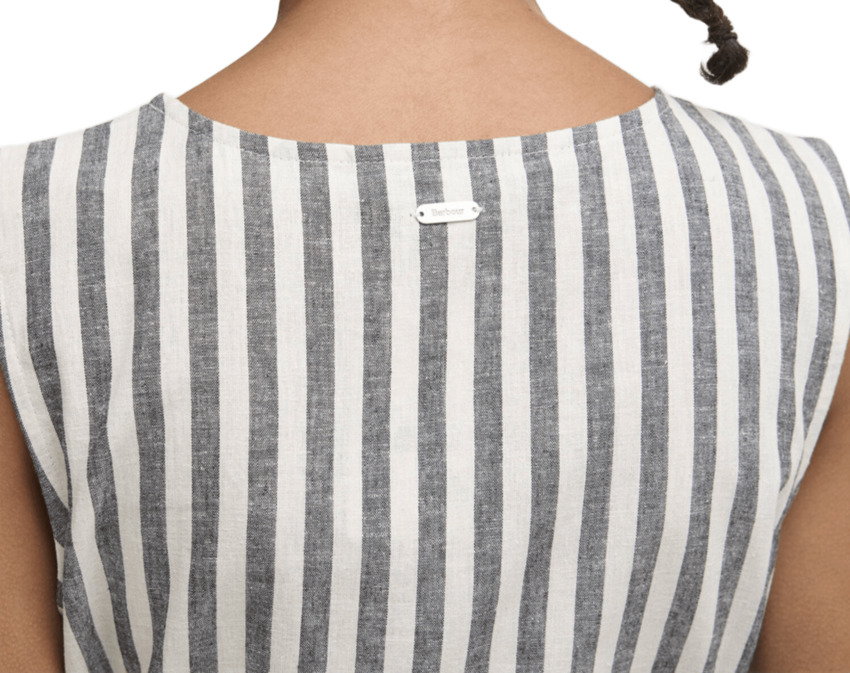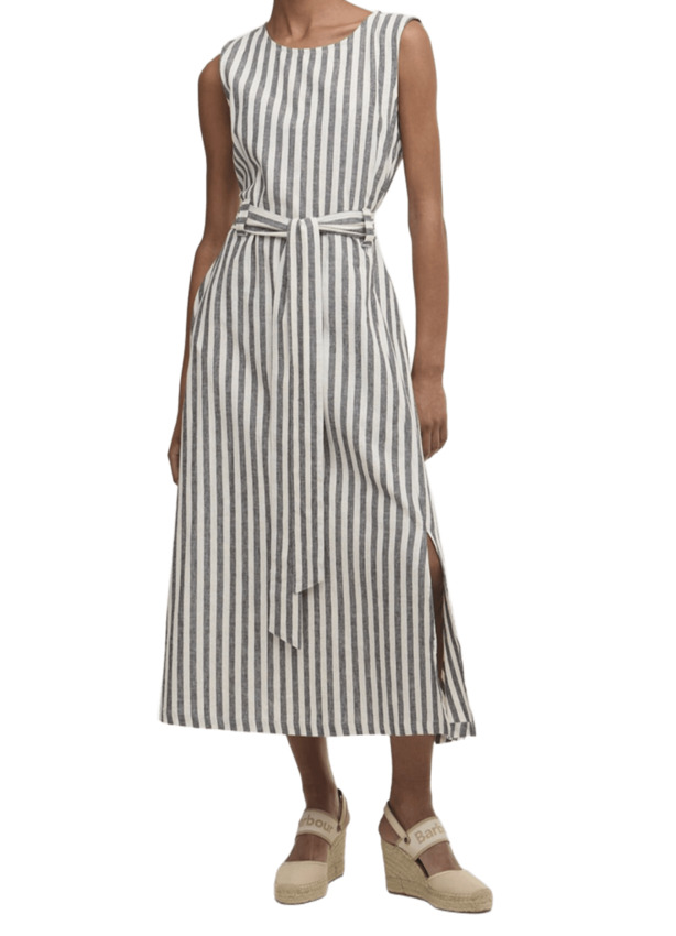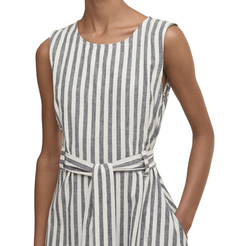 L'abito midi Inez con motivo a righe è un capo estivo senza tempo, realizzato in un misto di cotone e lino leggero e traspirante. Caratterizzato da un taglio senza maniche e una cintura da annodare in vita, questo capo sfoggia una silhouette splendidamente femminile. La lunghezza midi esalta leleganza del capo, mentre il morbido drappeggio assicura un comfort ottimale per tutto il giorno.