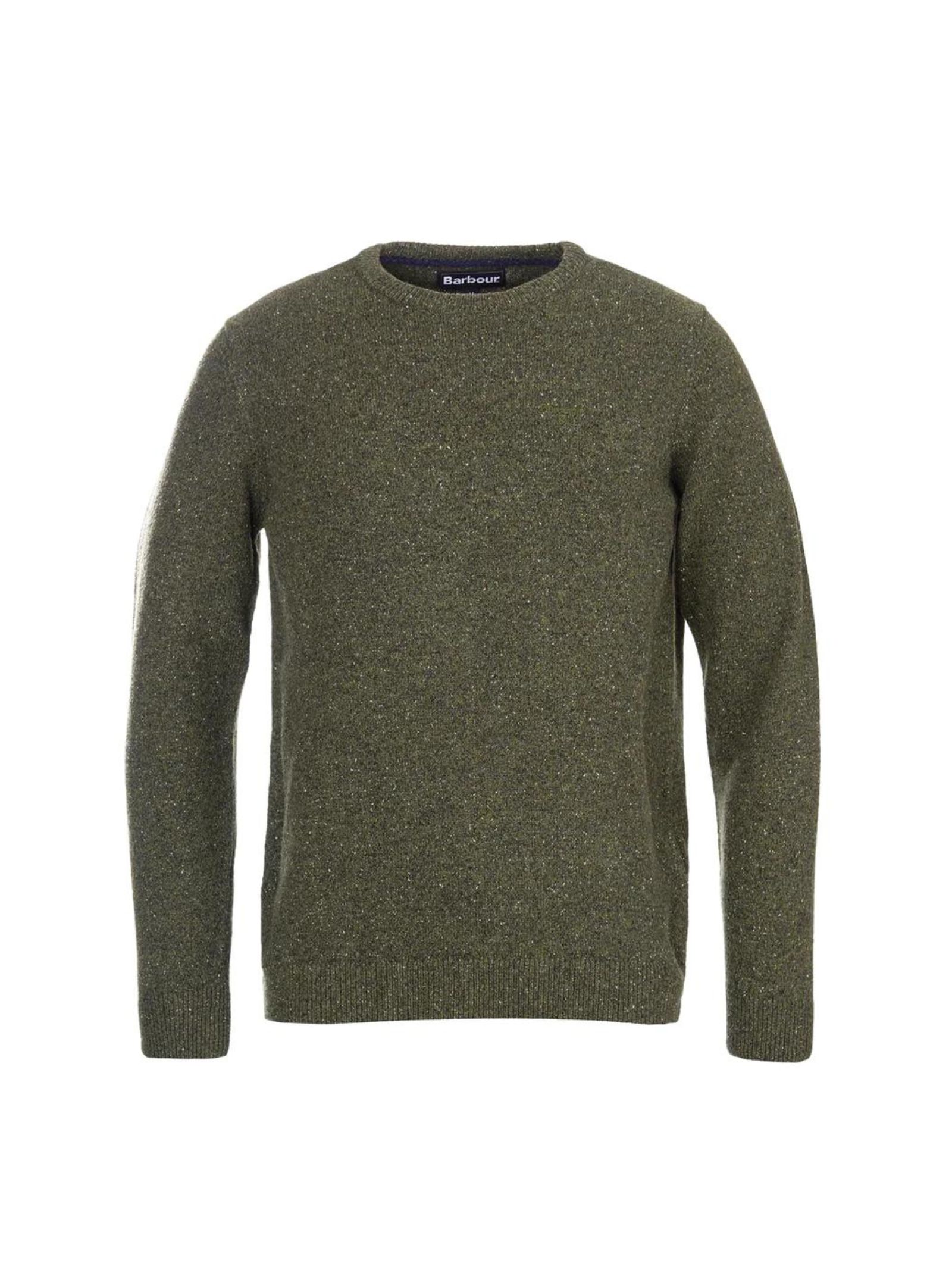 Maglione da uomo Barbour modello Trisbury a girocollo a costine, lavorato a maglia in misto lana e colorazione maculata. Presenta polsini e orlo a coste. Rinifito con il logo del brand. Ideale per un abbigliamento elegante che casual.