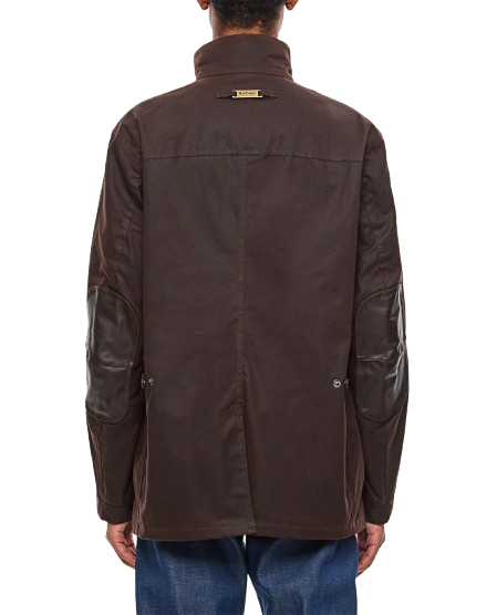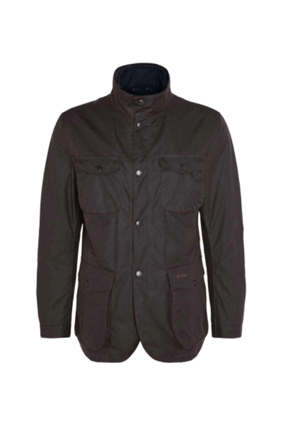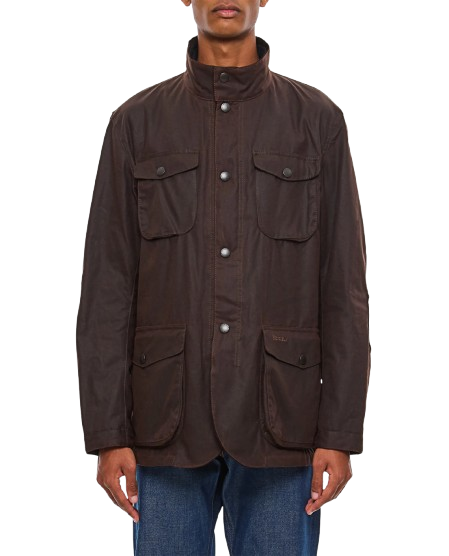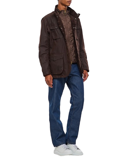 Giacca in cotone cerato, con toppe sui gomiti presenta chiusura frontale con bottoni automatici logati e patta frangivento. Patta antivento interna, fissa, chiusa con cerniera a doppio cursore. Un gilet trapuntato integrato crea un look outdoor e fornisce un ulteriore strato di calore, chiudendosi fino al colletto alto con una zip a logo Barbour. Fodera in velluto a coste.