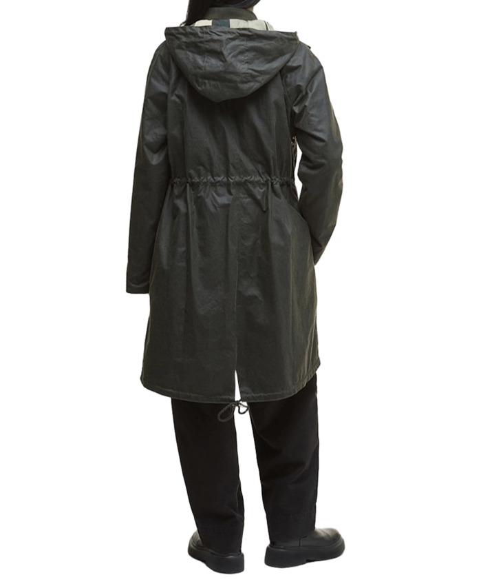 Parka da donna in cotone cerato con cappuccio e coulisse in fondo colore verde oliva