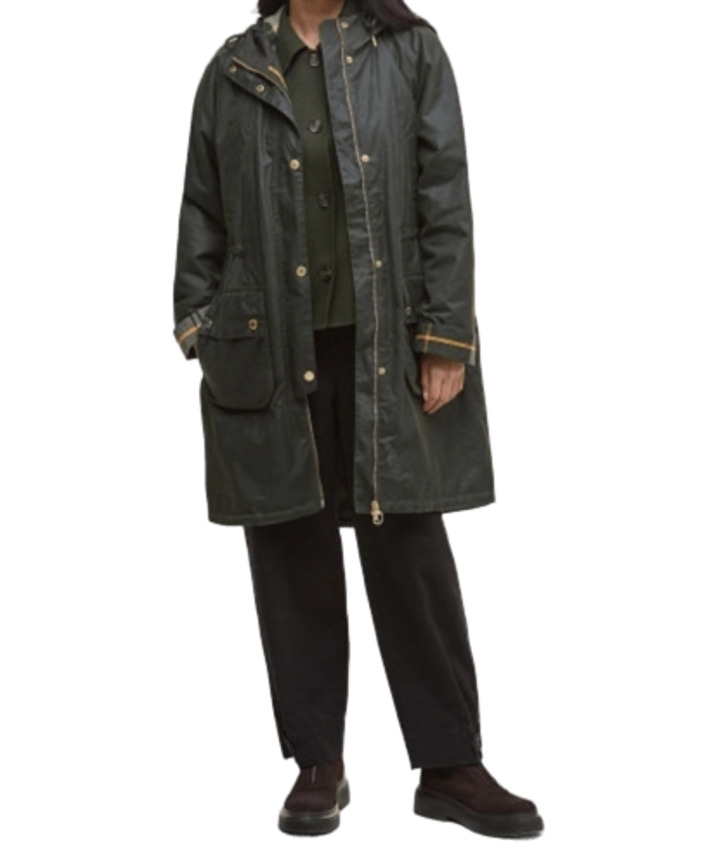Questo parka cerato con capppuccio presenta una cerniera frontale nascosta da una patta a tre quarti con borchie, che offre un'eccelente protezione dagli agenti atmosferici. Le tradizionali tasche scaldamani e le tasche a soffietto offrono ampio spazio per i tuoi oggetti essenziali . Il cordino sul cappuccio e sull'orlo consente una vestibilità regolabile per protegggere dal vento e pioggia. Il giaccone è completamente foderato con il caratteristico tartan Barbour su busto, cappuccio e sotto i polsini, aggiungendo un tocco di fascino tradizionale e calore extra.
