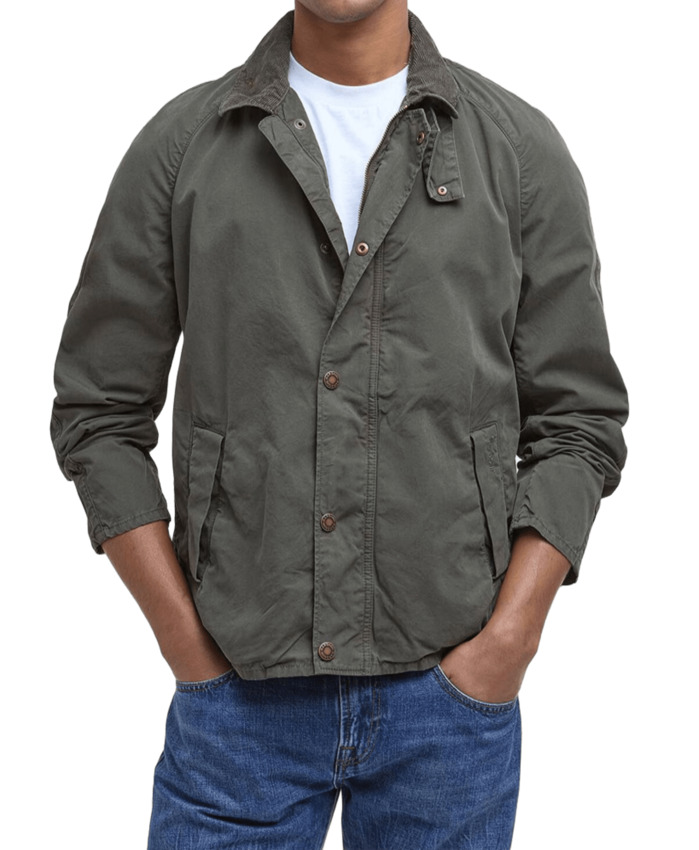 Questa giacca leggera presenta colletto in velluto a coste ed è dotata di una chiusura frontale con zip e bottoni a pressione che aggiunge un tocco inconfondibile.