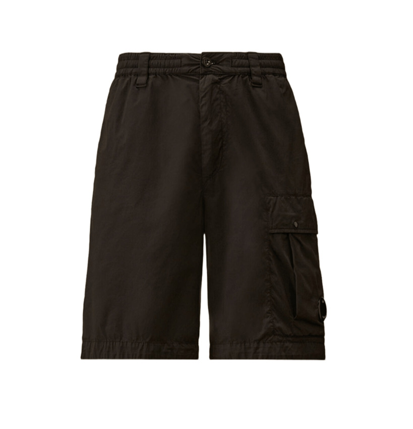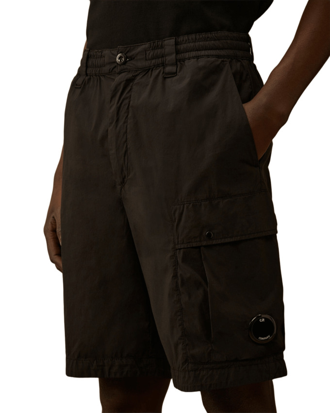 Bermuda cargo realizzata in 50 Fili Stretch presenta una vita regolabile con coulisse, una chiusura con bottone e zip e passanti per cintura. Il design è completato da tasche laterali, una tasca cargo con patta, bottoni automatici e liconica Lente di C.P. Company, e una tasca posteriore con bottone automatico ed etichetta con logo applicata. La bermuda è tinta in capo per ottenere intensità cromatiche uniche che si esaltano con il tempo e lutilizzo.