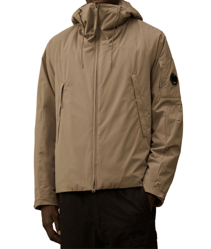 Giacca imbottita con cappuccio realizzata in Pro-Tek, un poliestere mechanical stretch, che combina il peso e il comfort di una maglia con la protezione di un capospalla. Il capo presenta liconica Lente di C.P. Company, una chiusura full zip a doppio cursore e tasche laterali con zip. Imbottita con ovatta Primaloft® Silver, una soluzione isolante con elevate proprietà termiche e traspiranti. Trattata anti-goccia.