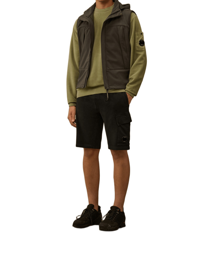 Shorts realizzati in fleece leggero garzato. Il tessuto morbido e traspirante assicura comfort e libertà di movimento. Il modello è completato da vita regolabile con coulisse, tasche laterali e tasca cargo con patta, bottoni automatici e l'iconica Lente di C.P. Company. Tinti in capo.