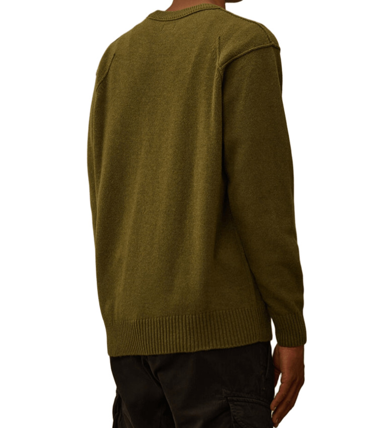 Maglione girocollo realizzato in Lambswool GRS. La certificazione Global Recycled Standard garantisce il rispetto di criteri ambientali e sociali in tutte le fasi della filiera. Il capo presenta liconica Lente di C.P. Company, cuciture a contrasto, polsini e orlo a costine.