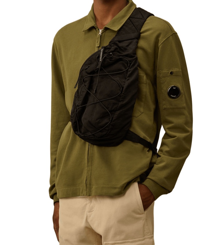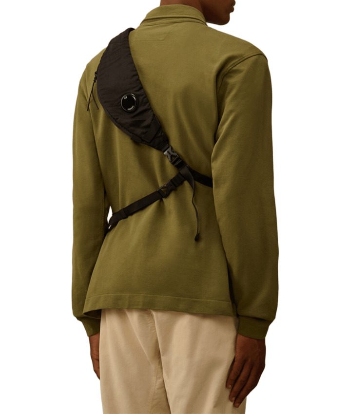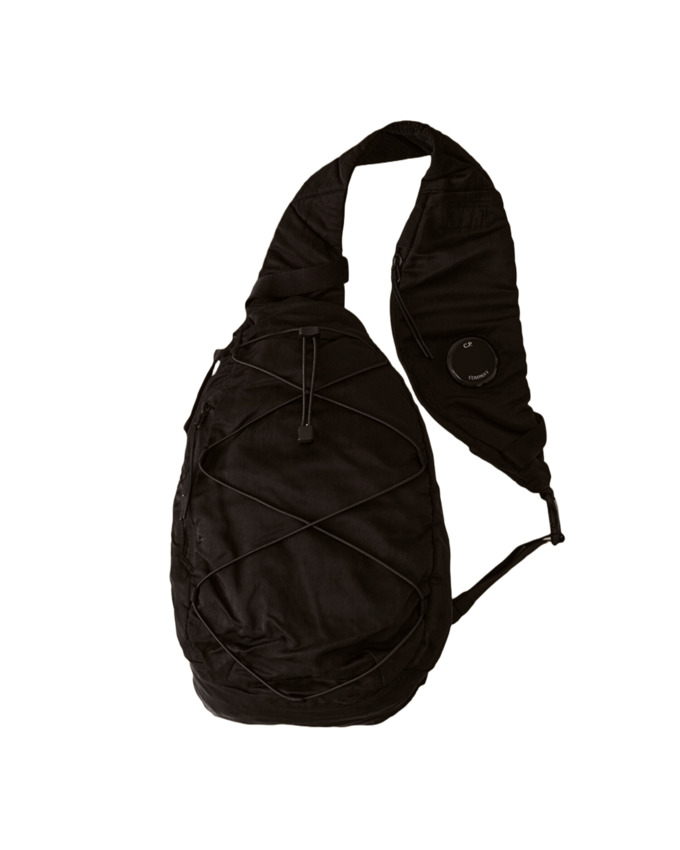 Zaino a tracolla realizzato in Nylon B, un nylon multi-filamento raso di ispirazione militare. Lo zaino è dotato di una tracolla regolabile con chiusura a fibbia, tasche posteriori con zip e velcro e altre tasche con zip. All'interno è presente una tasca con bottone automatico e logo. Rifinito con l'iconica lente di C.P. Company. Tinto in capo e trattato antigoccia.