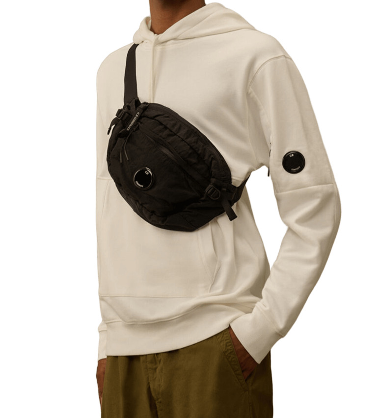 Marsupio a tracolla realizzato in Nylon B, un nylon multi-filamento raso di ispirazione militare. È dotata di una tracolla regolabile con fibbia, impugnatura e tasche esterne con zip. All'interno, una tasca zip e logo. Rifinito con l'iconica lente di C.P. Company. Tinto in capo e trattato antigoccia.