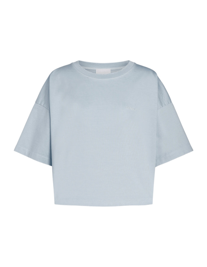 T-shirt girocollo in jersone trattato, cropped a maniche corte con logo DONDUP ricamato sul petto.
