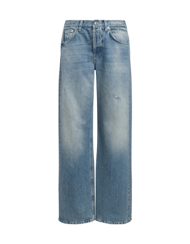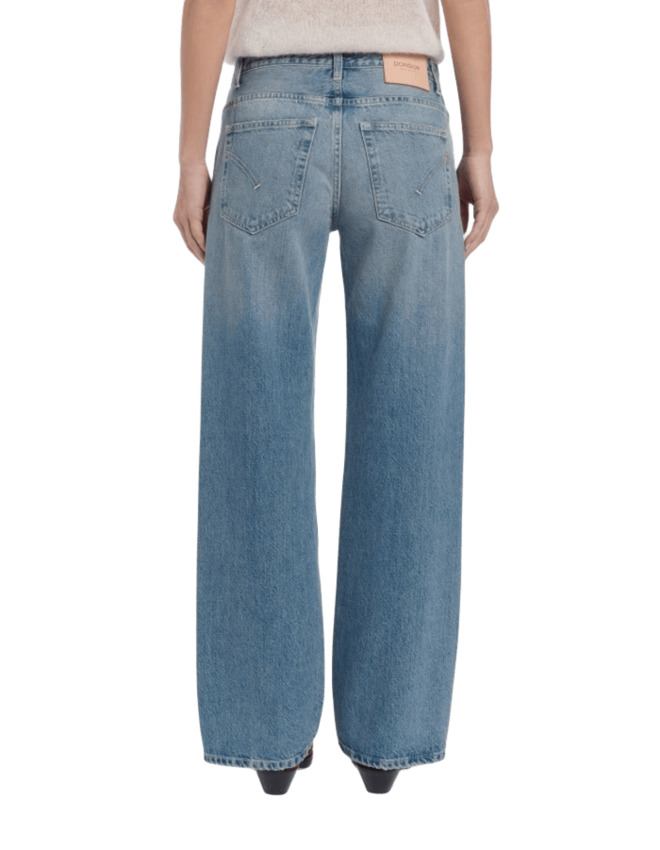Jeans Jacklyn cinque tasche wide leg fit, vita bassa, gamba a palazzo. Denim fisso sale pepe blu 13 oz. Lavaggio vintage chiaro con rotture. Logo Dondup.