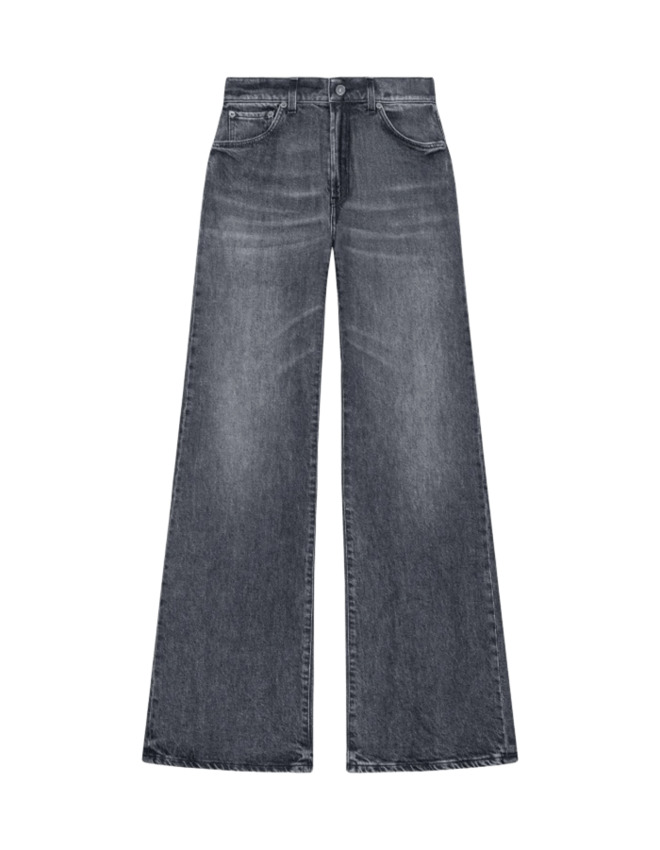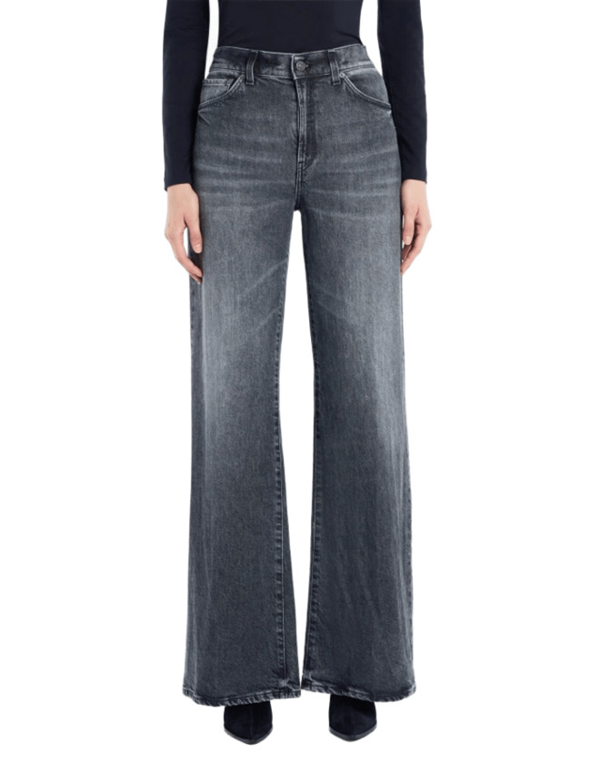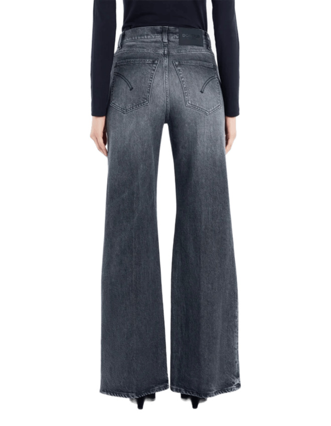 Jeans Amber cinque tasche wide leg fit, vita regolare, gamba ampia. Denim stretch comfort nero 14 oz. Lavaggio nero vintage pulito. Logo Dondup.
