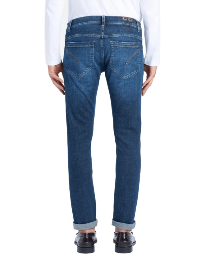Jeans George cinque tasche skinny fit, vita bassa, taschino a filetto. Denim stretch responsabile blu 13 1/4 oz. Lavaggio scuro pulito gots. Logo Dondup.