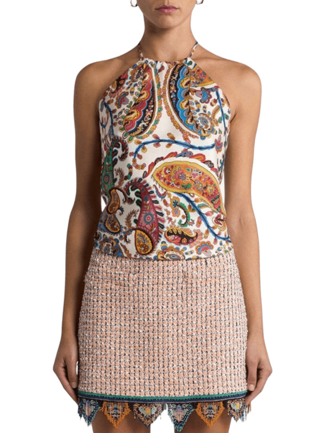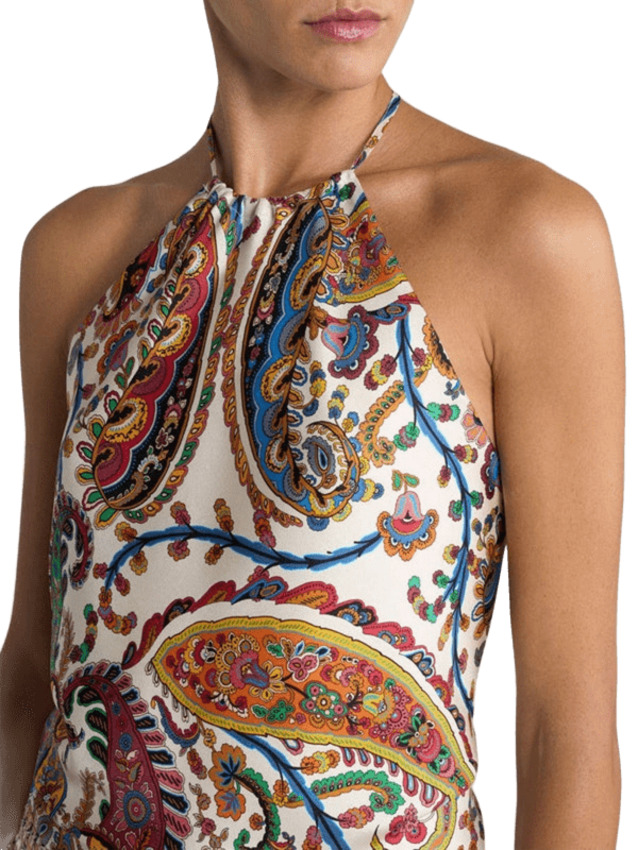 Top dal design a bandana realizzato in twill di pura seta e decorato da un motivo Paisley floreale all over. Lo scollo all'americana con laccetti sul retro del collo e la chiusura tramite due lembi da annodare, sempre sul retro, lasciano la schiena quasi interamente scoperta.