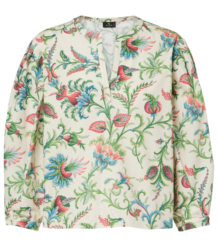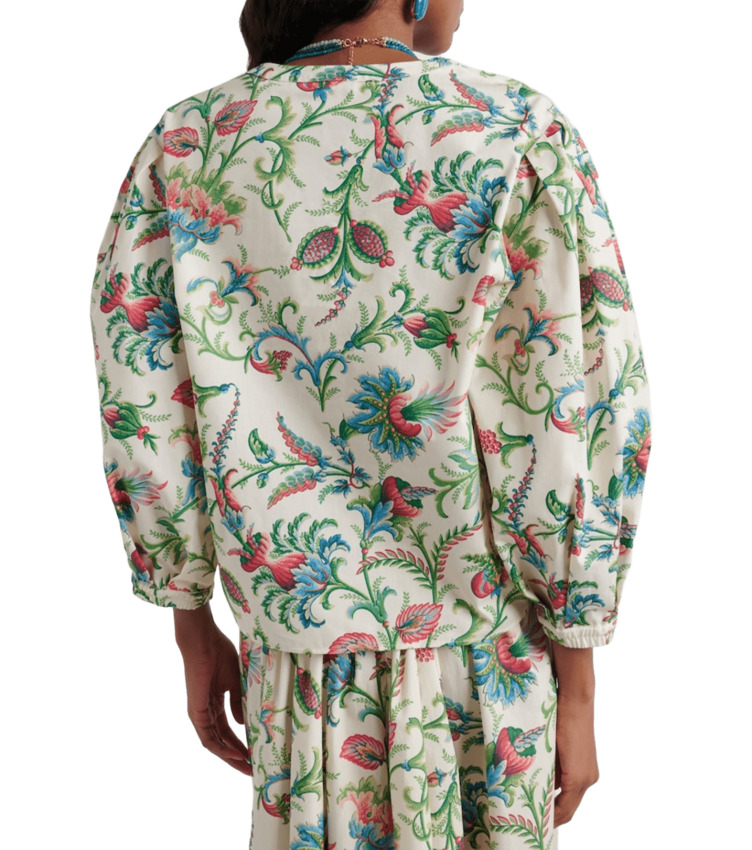 Blusa dal taglio boxy realizzata in popeline di puro cotone con morbide maniche a palloncino. Il modello si distingue per il raffinato motivo multicolore ispirato al mondo della natura.