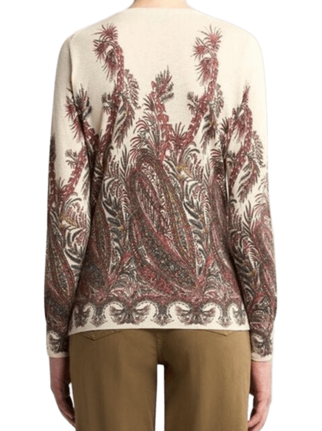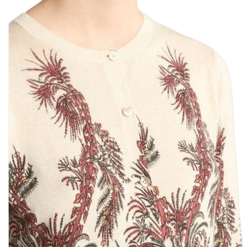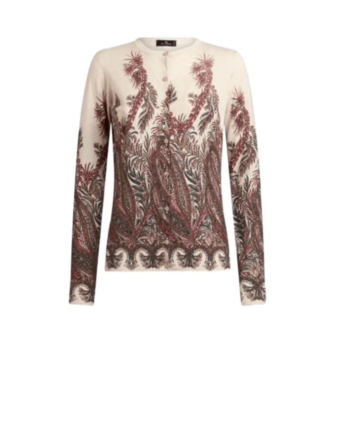 Cardigan girocollo realizzato in seta misto cashmere con finiture a costine e chiusura con bottoni. Contraddistinto da una stampa Paisley floreale piazzata.
