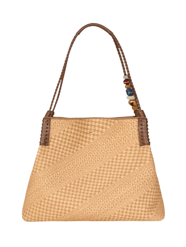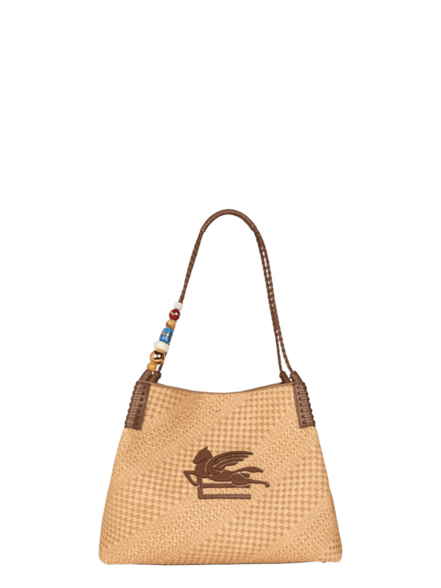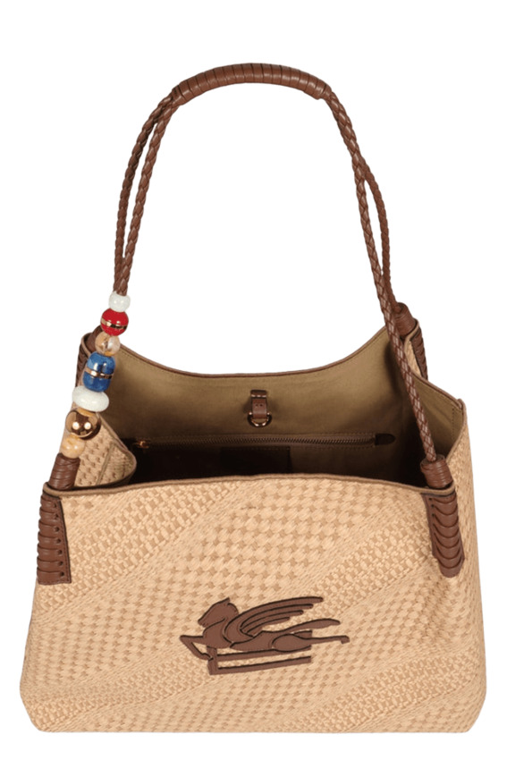 Borsa shopping Libra grande realizzata in rafia e arricchita da un'applicazione con logo Pegaso ricamata sul davanti. L'accessorio presenta una lavorazione con infilature sugli angoli superiori e due ampi manici intrecciati in pelle, per una portabilità a mano o a spalla, di cui uno decorato con raffinate biglie multicolor.Tasca interna a parete con cerniera