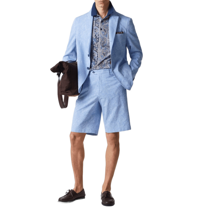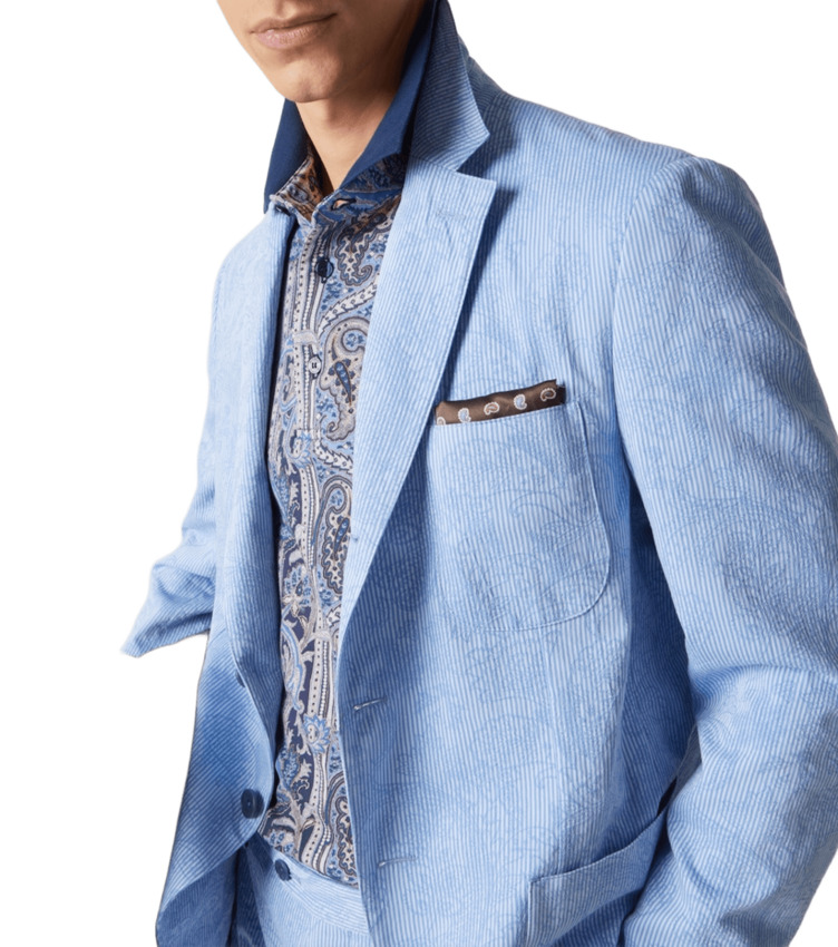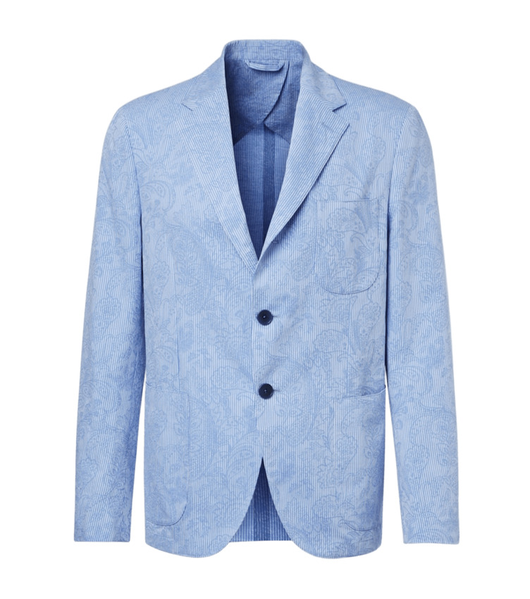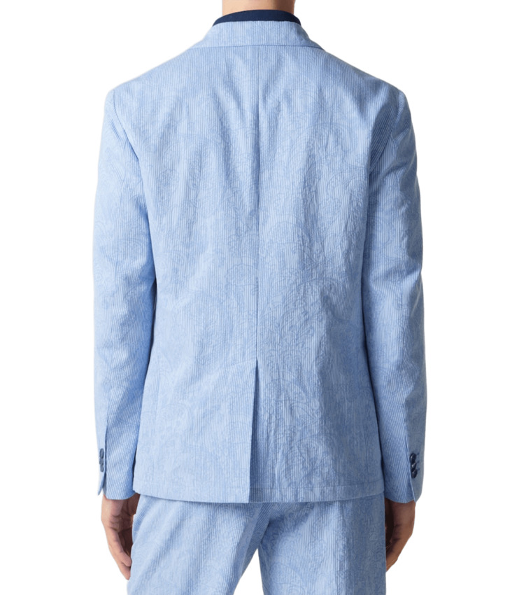 Giacca sartoriale realizzata in puro cotone seersucker a righe e contraddistinta da un motivo floreale jacquard con dettagli Paisley. Il modello presenta tre ampie tasche applicate sul davanti ed è completato dalla chiusura monopetto con bottoni logati.