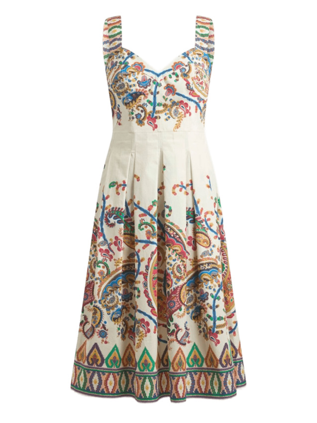 Abito midi smanicato realizzato in popeline di puro cotone e dotato di una gonna svasata e plissettata con morbide arricciature. Il modello si distingue per l'elegante stampa piazzata con motivo Paisley floreale multicolore e per la fantasia geometrica lungo le spalline e il fondo.