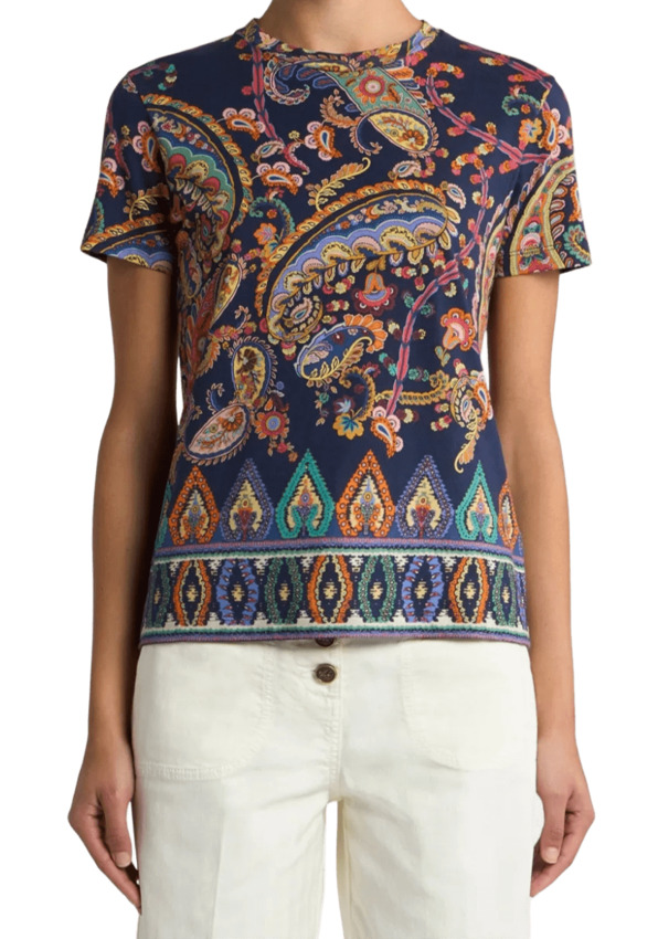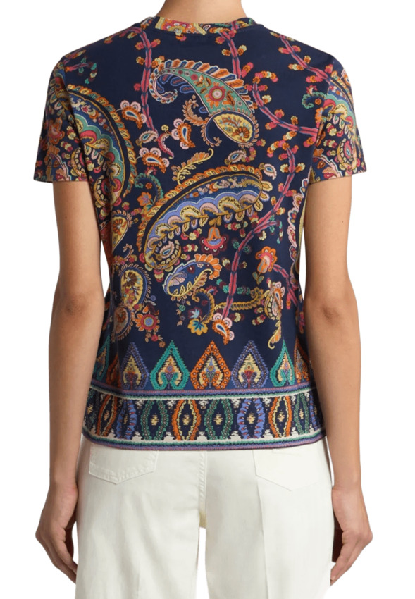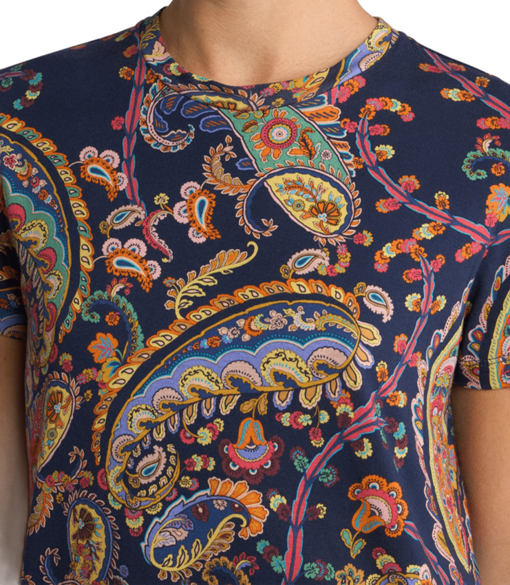 T-shirt girocollo a maniche corte realizzata in puro cotone. Il capo dalla linea aderente si distingue per il motivo Paisley d'ispirazione floreale con medaglioni sul fondo.