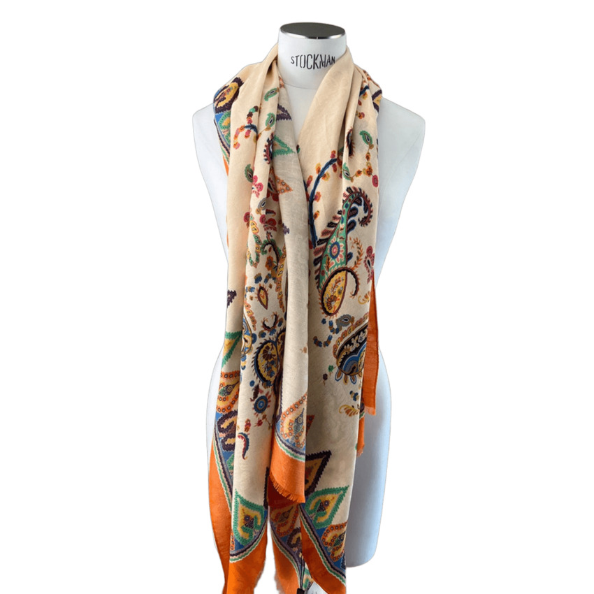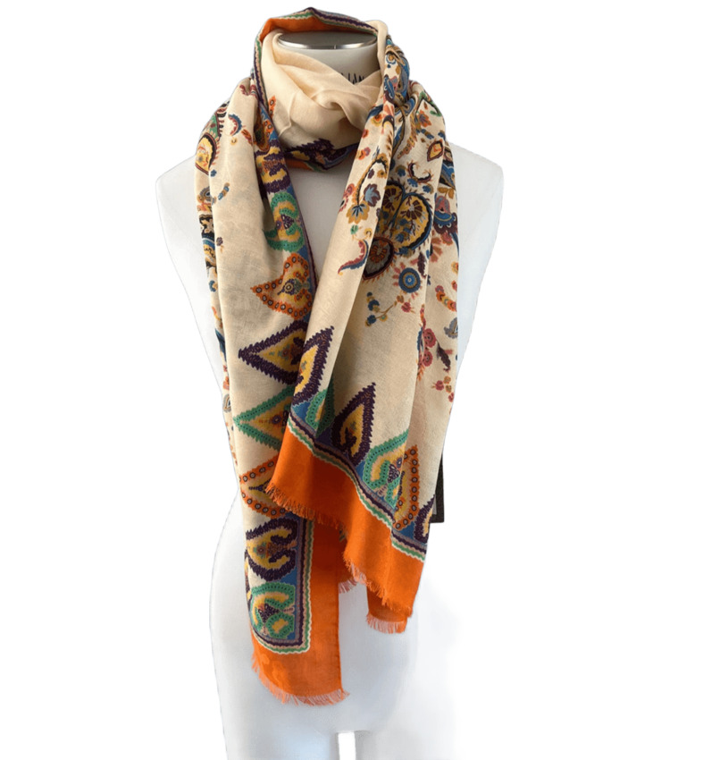 Sciarpa in cotone misto modal jacquard arricchita da una fantasia Paisley d'ispirazione floreale incorniciata da un motivo medaglioni con bordi a contrasto. Completano il design il logo ETRO e i lati corti leggermente sfrangiati.