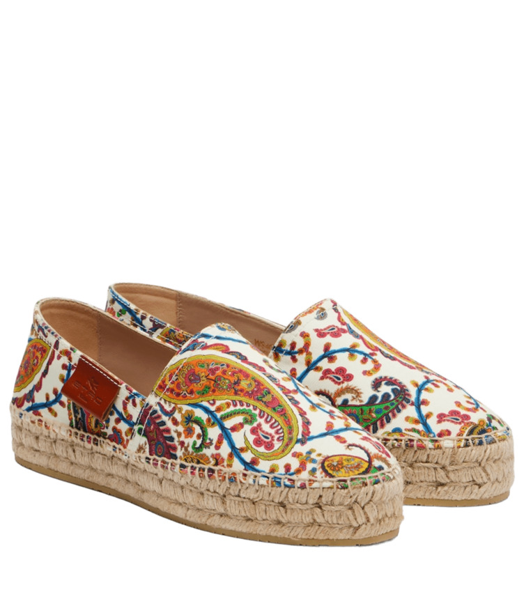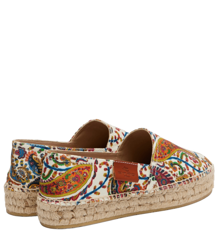 Espadrillas realizzate in gabardine di cotone e decorate da un motivo Paisley floreale all over. Il modello, personalizzato da un'etichetta laterale in pelle con Pegaso e logo ETRO, è completato dalla suola in juta intrecciata.