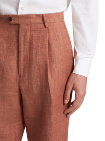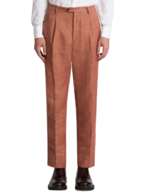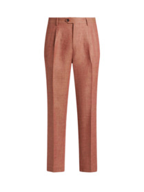 Pantaloni sartoriali in tessuto fiammato di misto lino e cotone. Il modello è arricchito da pince frontale e piega stirata.