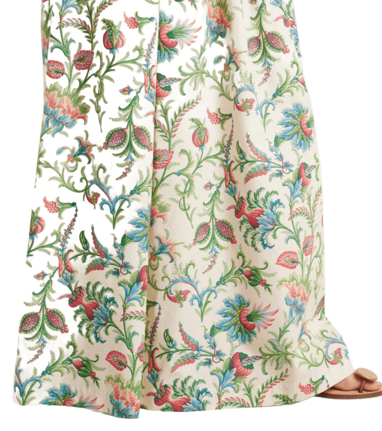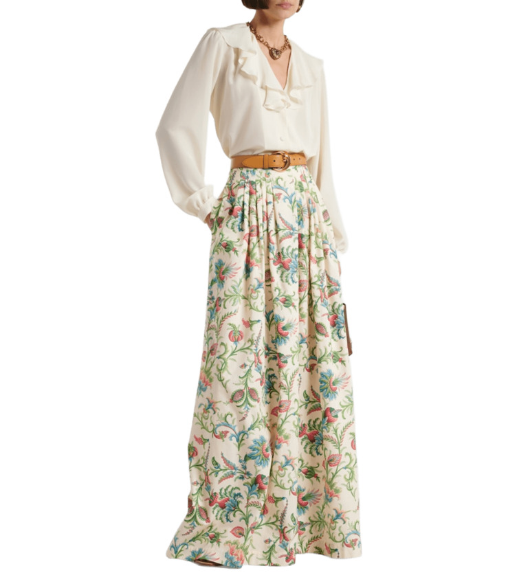 Gonna lunga realizzata in popeline di puro cotone e contraddistinta da un elegante motivo multicolore. Il modello a vita alta è rifinito con plissettature fronte e retro e tasche laterali a filo.