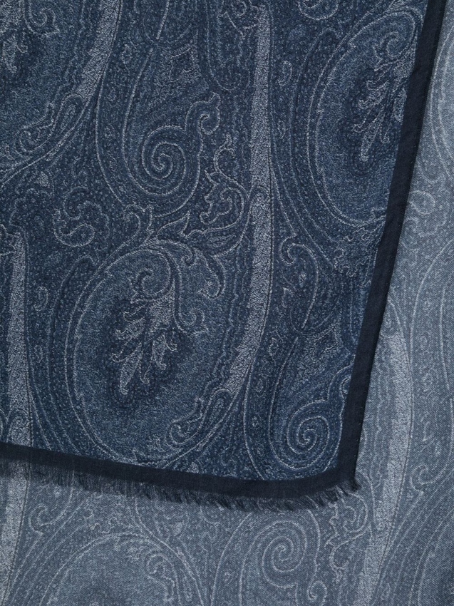 Sciarpa in misto cashmere con stampa timbrata paisley all over. L'accessorio è impreziosito da logo ETRO e Pegaso. Bordi decorati con piccole frange