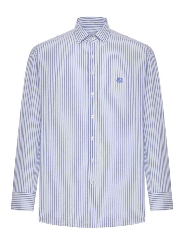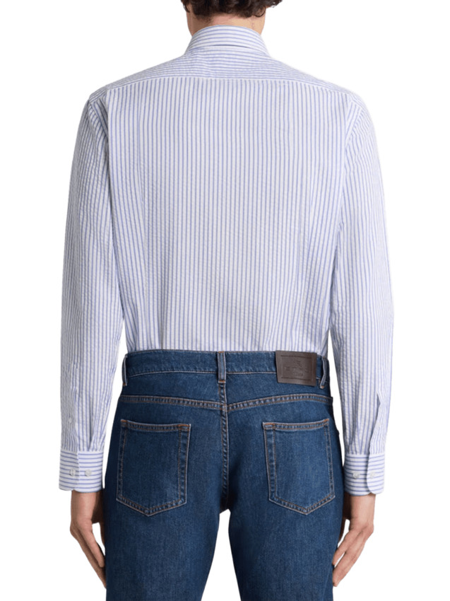 Camicia realizzata in puro cotone seersucker con fantasia a righe. Il capo è rifinito con un piccolo ricamo con logo Pegaso in corrispondenza del petto.