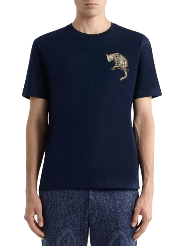 T-shirt girocollo a maniche corte realizzata in morbido cotone tinta unita. Il modello è arricchito da un piccolo leopardo stampato sul petto che poggia sul logo ETRO ricamato.