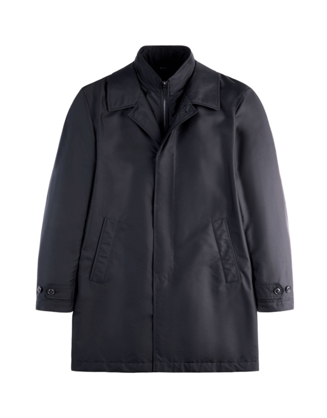 Con tasche a filetto e fondo manica con fascetta e bottone, presenta una chiusura con zip e bottoni nascosti che rimandano al mondo degli impermeabili british. Completa il capo un taschino interno.