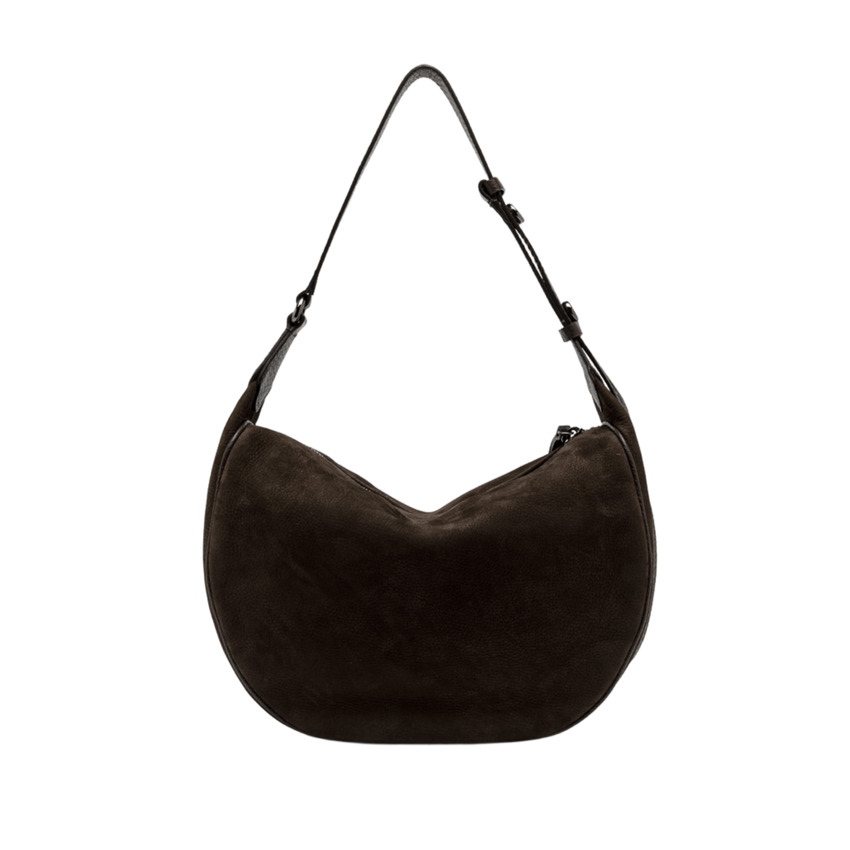 Charlotte è la nuova borsa a spalla in pelle nabuk, dal design essenziale e una morbida silhouette hobo. Dotata di un ampio scomparto principale con zip e tirazip in pelle con dettagli metallici, offre funzionalità senza rinunciare all'eleganza. Il manico regolabile consente una portabilità versatile, rendendola un accessorio ideale per ogni occasione.