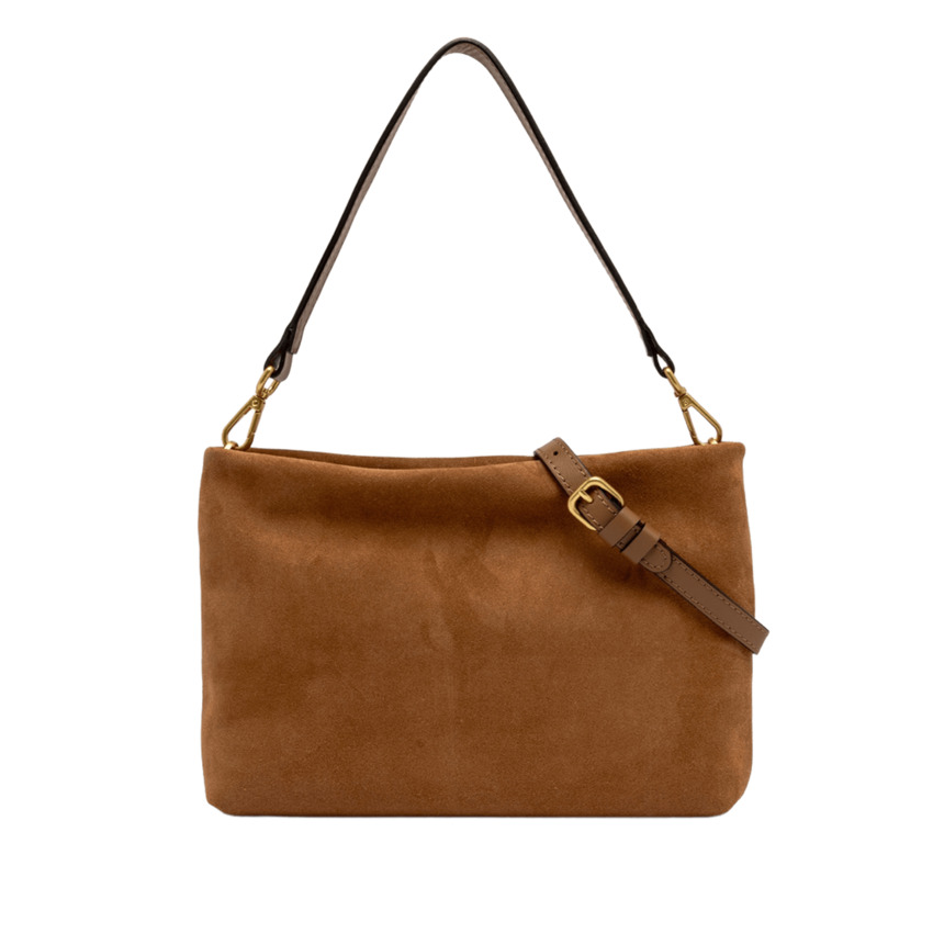 Brenda di Gianni Chiarini Firenze, è una pochette in pelle scamosciata impreziosita da un manigliotto removibile in pelle. All'interno presenta una pratica tasca piatta. Dotata di una tracolla in pelle regolabile e removibile, può essere indossata comodamente anche crossbody.