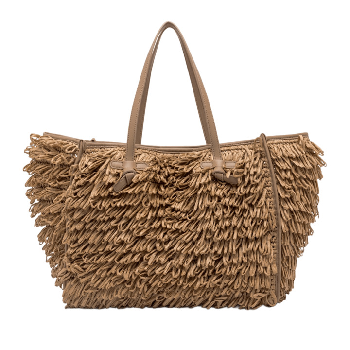 Questa versione di Marcella è realizzata in tessuto con riccioli di rafia intrecciati a mano. Frizzante e leggera, è l'accessorio ideale per connotare di stile i look estivi. Dotata di manici in pelle e di una comoda chiusura tramite magnete. Presenta internamente dei tasconi che la rendono ancora più pratica e ben organizzata.